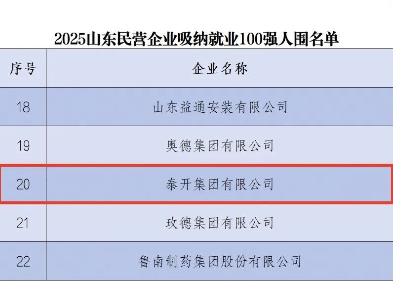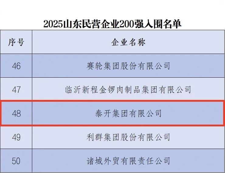 8月11日,山东省工商联发布2025山东民营企业200强入围名单,泰开集团位居第48位,较2024年提升4位;位居“2025山东民营企业吸纳就业100强”第20位。